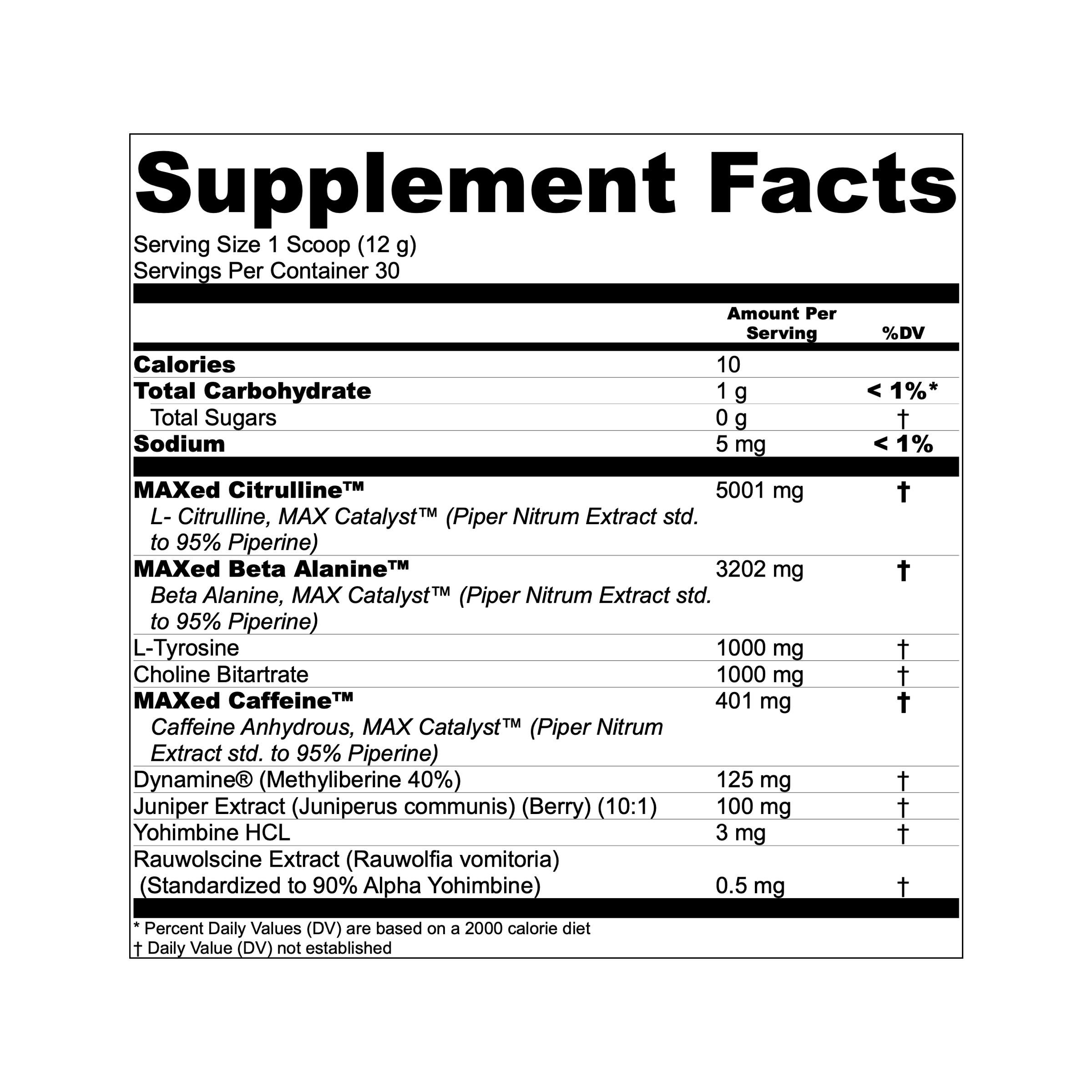 It's pretty simple: we made a high-stimulant preworkout that will light a fire under your ass and has the right formulation to reduce the crash. This preworkout contains 401mg of MAXed Caffeine™ for increased energy, focus, and performance; 5001mg of MAXed Citrulline™ for enhanced nitric oxide production, stronger pump, and enhance power; and 3202mg of MAXed Beta-Alanine for heightened power, improved strength, and fatigue reduction with less of the face tingling.
